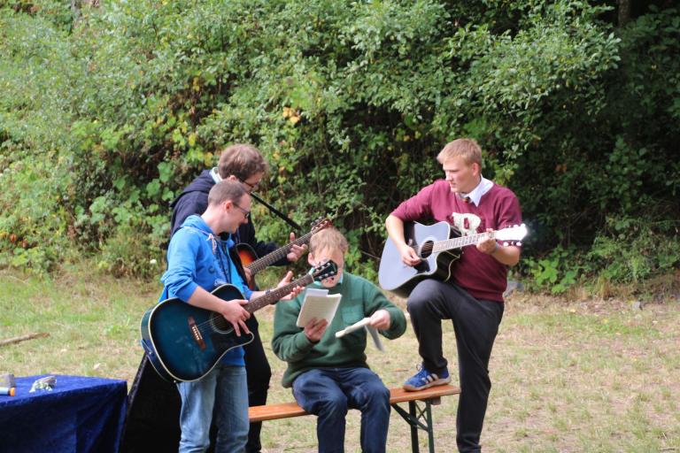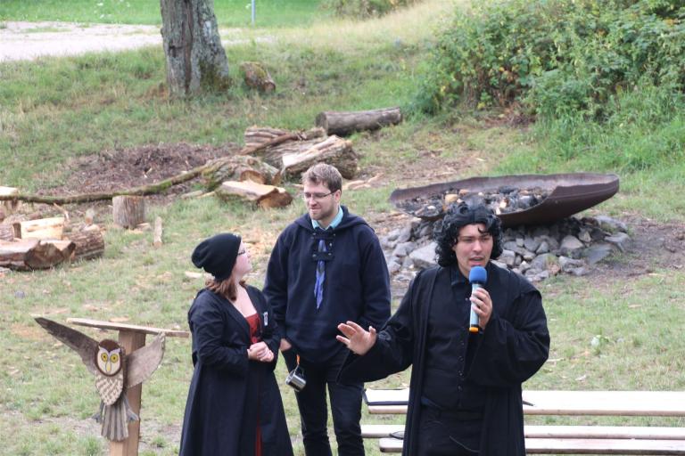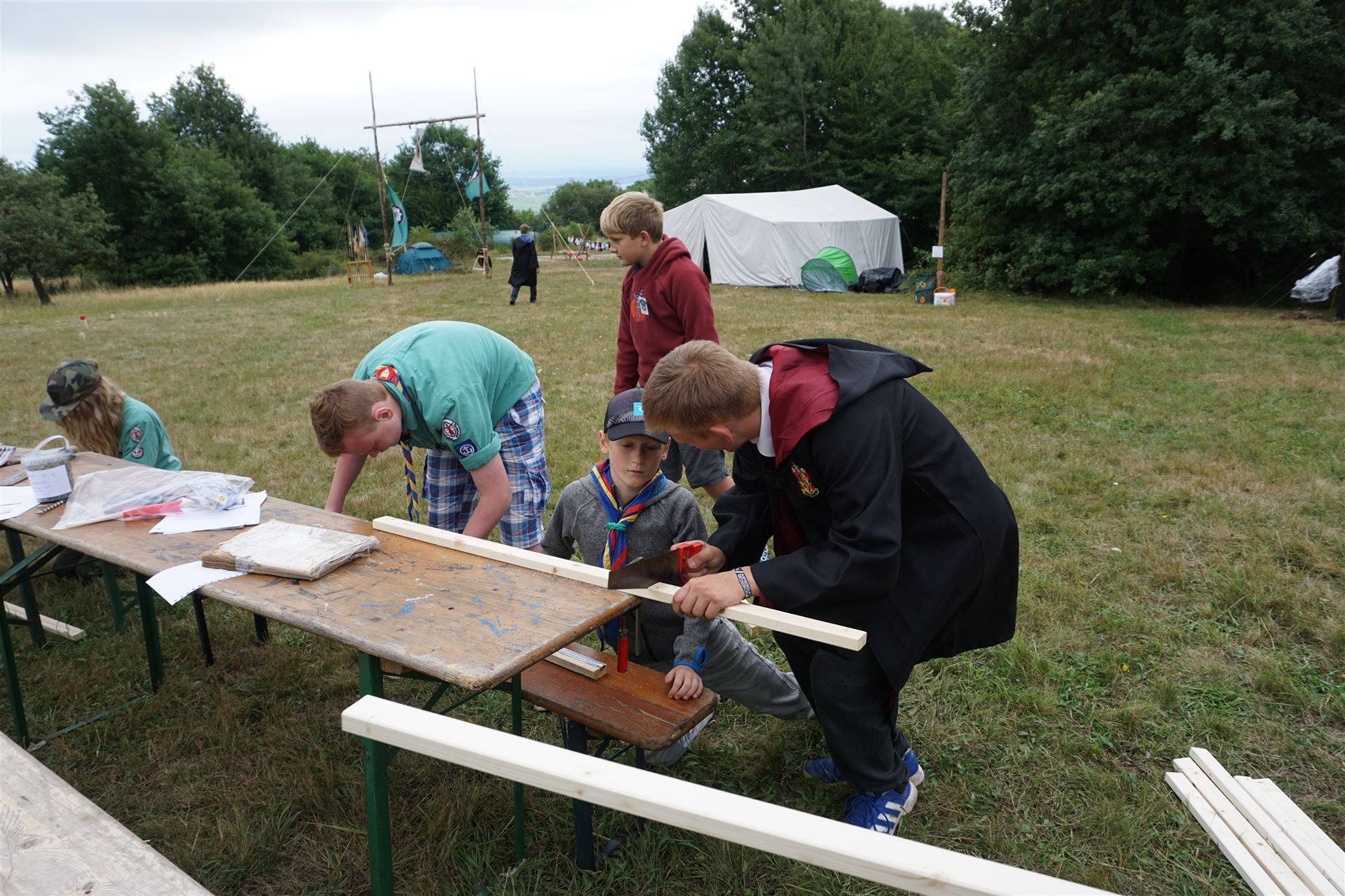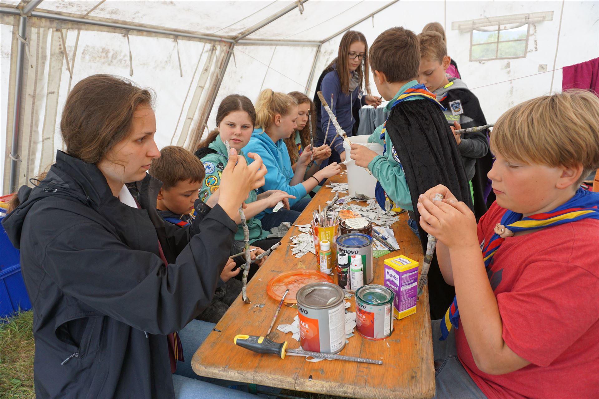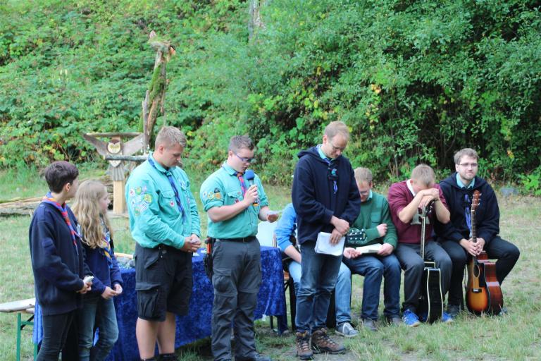 erst gab es einen Gottesdienst. Danach fanden AGs (Messerprüfung, Holzbauten, Zauberstab, Schwedenstuhl, Knoten, Gipsmasken) statt.